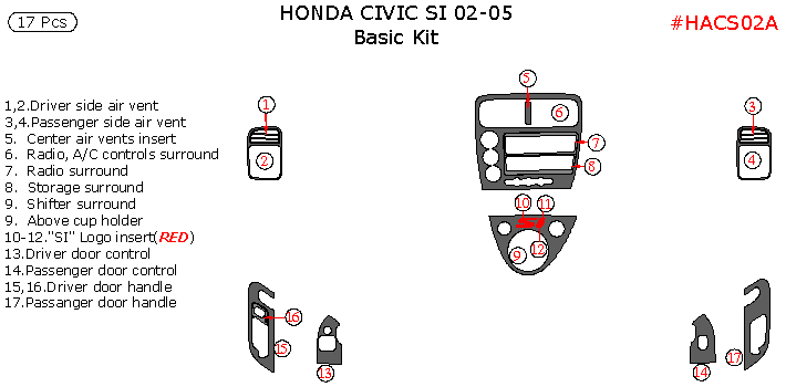 Honda Civic Si 2002 2003 2004 2005 Basic Interior Kit 17 Pcs